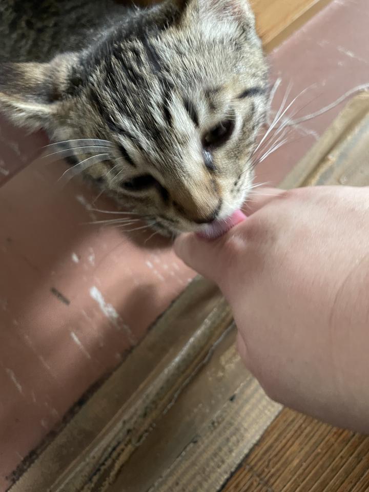 部屋でリラックスしていたら、なつちゃんが近づいて来たので人差し指出してご挨拶?したら舐めてくれた!