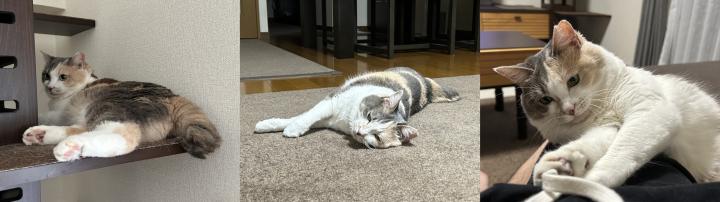 ●08/20(日) 週休タワーの上やカーペットでくつろいだり、ズボンの紐で遊んだり。