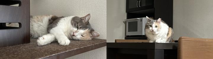 タワーの上で寝たり、食卓からこちらを窺ったり。