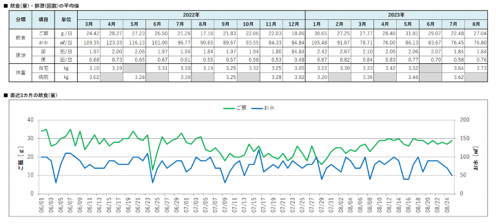 しもちゃんの飲食(量)・排泄(回数)に関する記録です。7月に入って一時食べる量が減っていたのですが、元に戻りました。