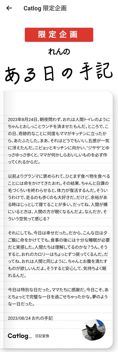 Catlogの期間&回数限定の企画。猫日誌の記録からGPT-APIを利用して日記化してくれる、8/31までに2回だけ、というので、まず1回ずつやってみた。