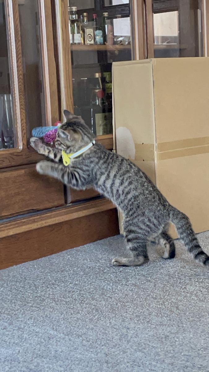 サイドボードにおもちゃ括りつけてぶら下げていたら猫パンチして遊んでいましたw