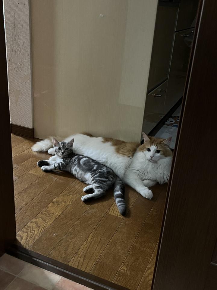 上の写真は私が子が寝てお風呂入ってドライヤーしてると甘え時を狙って待ってる2匹🤣