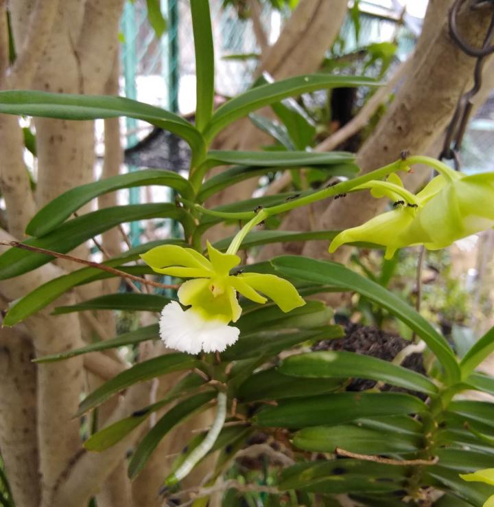 バンダ ベトナミカ ベトナム原産のラン、バンダの仲間では小型のものです。冬は室内のガラス箱に入れ、春から秋までは庭木にぶら下げて育てています。花の径は3cmほどです。🐦