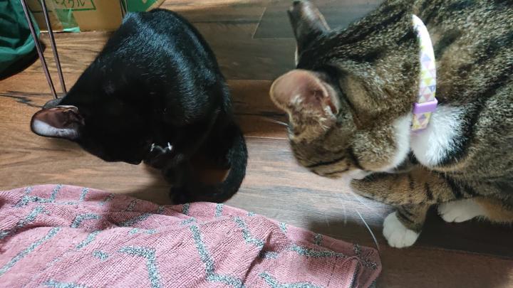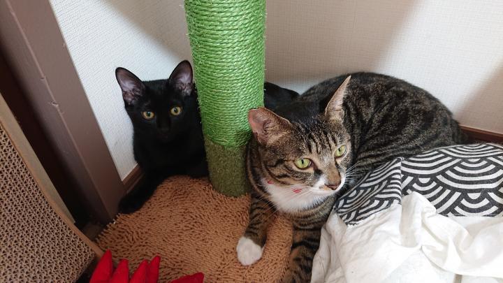 2歳のキジ白の女の子と4ヶ月の黒猫の子猫ちゃん、二人は仲良し。