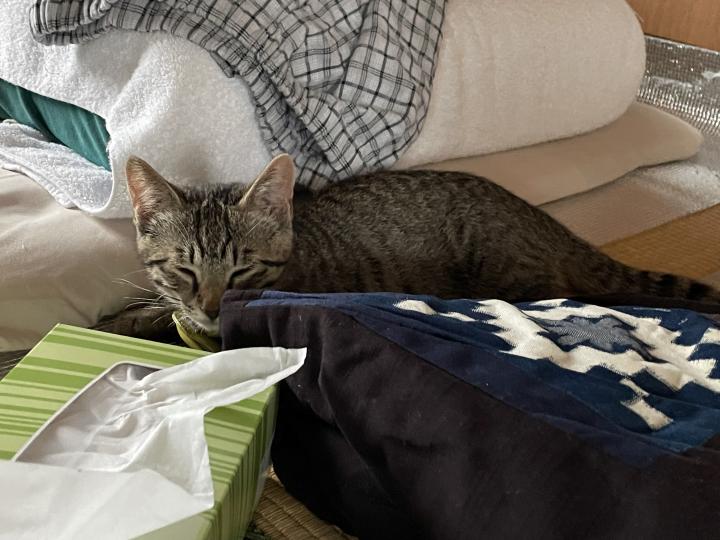 母ちゃんが家族のお布団を敷き直ししていると、なつさんは父ちゃんのお布団の側で寝ていました(¦3[_____]