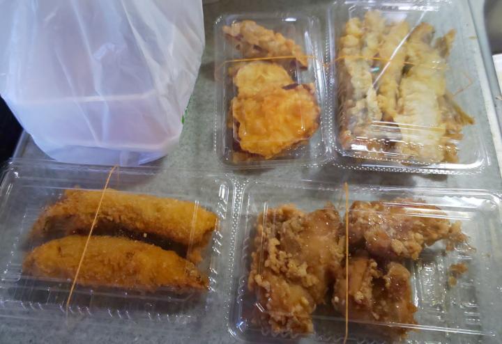 芋天、キス天、唐揚げ、茄子の豚バラ巻きカツ(時計回り)。