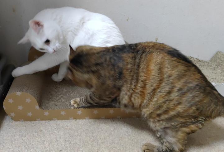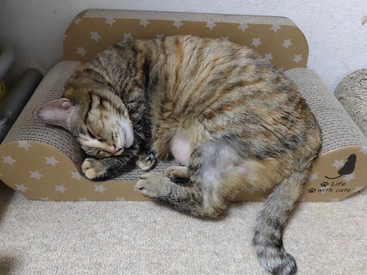 ちーちゃんは布のベッドが好きだけど、姫ちゃんはダンボール箱だったり、ダンボールの爪とぎベッドで寝てたりで、固いのが好きなのかな。