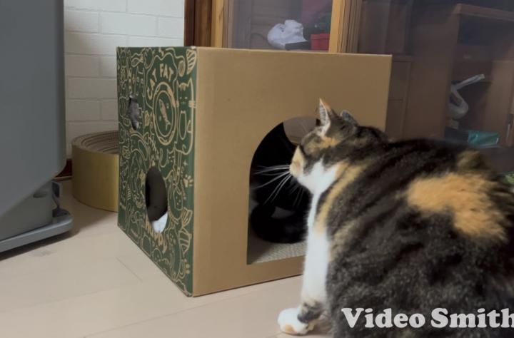 散々な追いかけっこの後、新しい爪とぎをめぐっての喧嘩が勃発💧