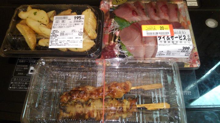 ポテトフライ・ぶりの刺し身・焼き鳥2本(もも・皮)