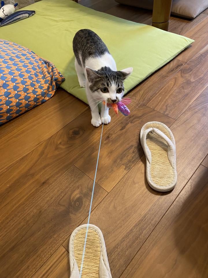 咥えて離さなくて、取ろうとすると唸り声をあげるので、そのかわいい唸り声を聞きたくてちょっと引っ張ってみたりしています。てへ。