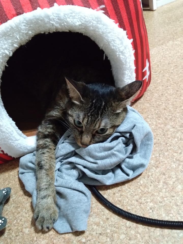 私の片付け忘れたTシャツを守ってるしおん🐱笑