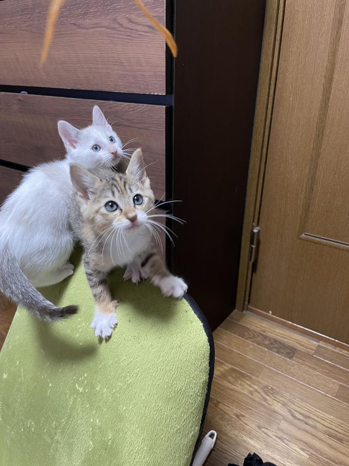 重量って何?と思うくらい飛び回って遊んでいます。2匹いっぺんにもらうのは勇気がいりましたが、一緒にもらって良かった。この元気に、としよりの先住達はついていけないものね。
