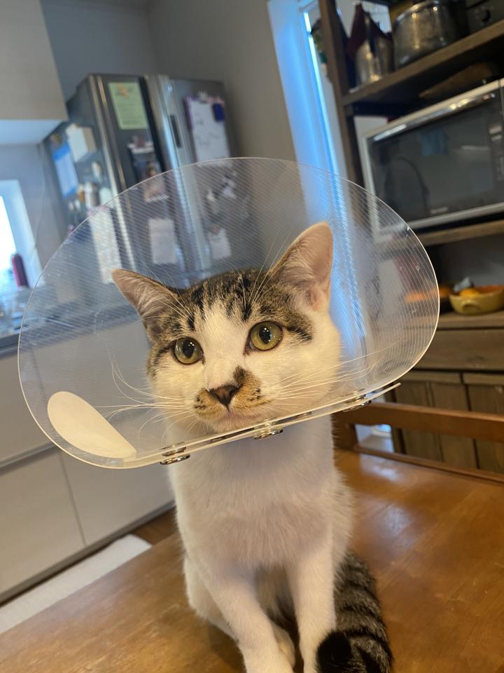 ぐったりしながらそれでも外したくて嫌がり、甘えたくて膝に乗りたいけどカラーが邪魔でうまく乗れなくて、痛いせいかヨロヨロして…。