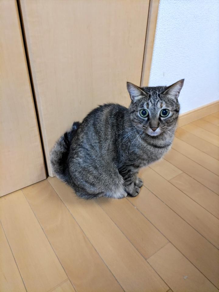 ご飯が欲しいと階段下収納の扉の前でかわいくアピールするりんちゃん♪
