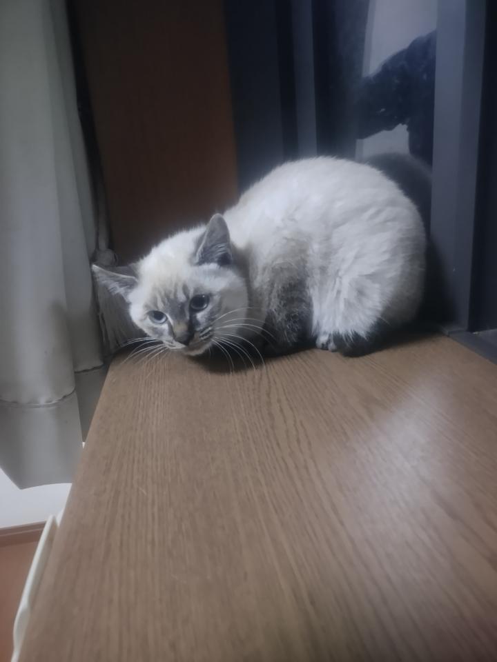 シャム太郎さんかも知れない。ちょっと大柄、少し長毛。保護2日目で撫でられる狸系。