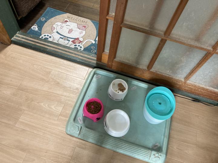 今まで和室だったのを前の猫さんと同じ場所のリビング前にご飯を食べる所を設けました。自動給水機も用意したのですが、最初は怖がってご飯も食べてくれませんでした。今日の朝はご飯は食べたけど、給水機使ってない!でも給水機は置き水よりも綺麗な水があげられるので、何が何でも使って欲しいので、意地でも置いておきます。