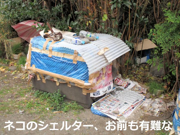 ネコは去年の7月、街外れの小さな公園に母親と小学生の子供が捨てて行ったそうです。それを目撃した向かいの高齢女性が餌の世話をされて来られました。元飼い猫の割には非常に憶病で、世話人さんに懐いたのは半年以上経ってからとかなりのビビリです。保護ボランティアの方が去勢手術とシェルターの用意をしてくれ、捨てられた公園への通路の片隅に許可をもらって設置しました。ネコはそこからほとんど動かずに、ずーっと同じ場所に居つづけたそうです。