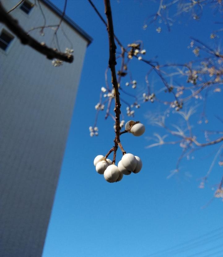 植えられています。落葉した枝先に、白い実がまばらに着いて独特