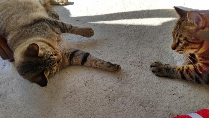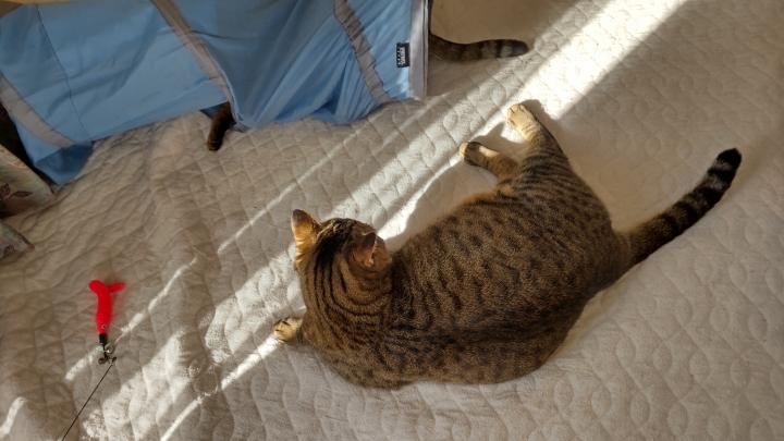 トラビスに追いかけられると、トンネルやキューブにチャッピーが隠れ、トンネルの上からトラビスがチャッピーをつかまえようとする、ということを延々しているけど、仲悪い?じゃれてる?よく分からない。チャッピーは怪我したりはないので、今のところは見守っています。