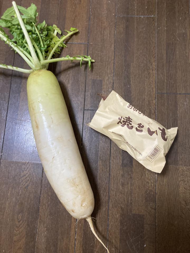 大根とサツマイモを貰いました。立派な大根さんて、一人暮らしには