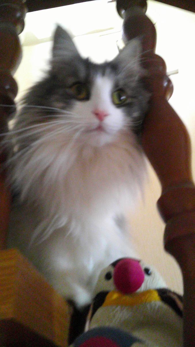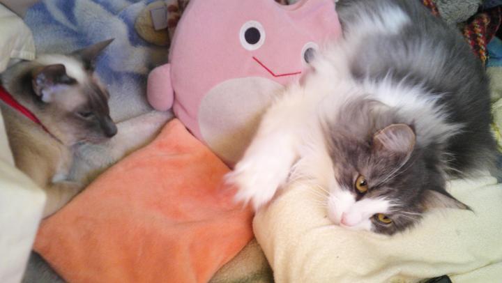 麻花瑠🐱「今日は ムラちゃん💜と一緒に写るー(*^-^*)」