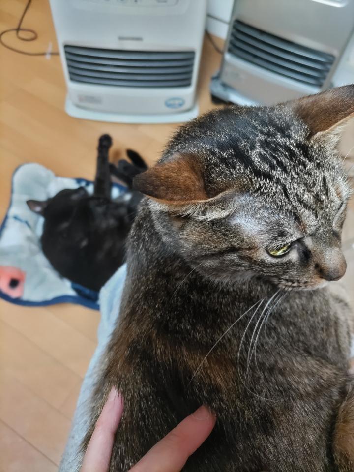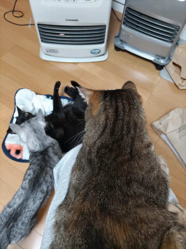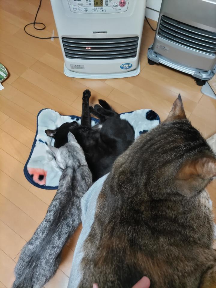 ファンヒーターの温風直撃で最高の寝床です。