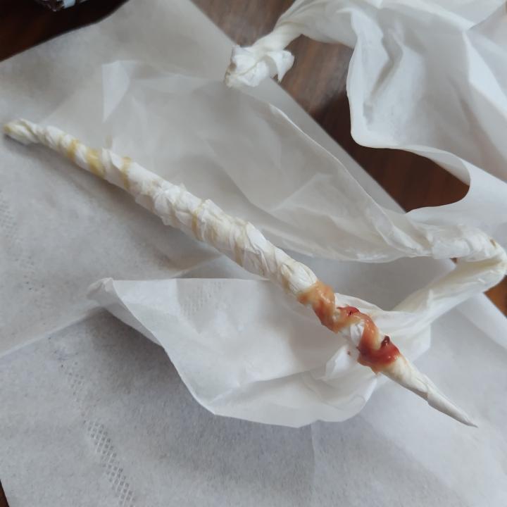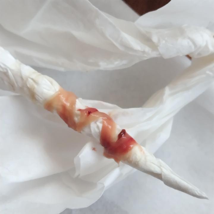 ティッシュで紙縒を作り、鼻水を巻き取っていく。