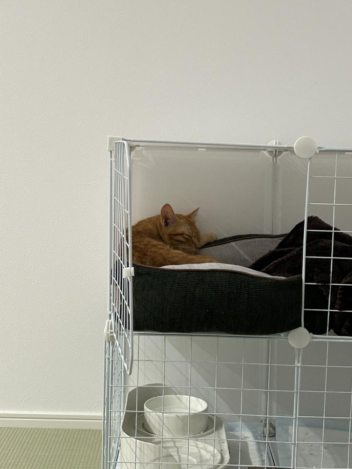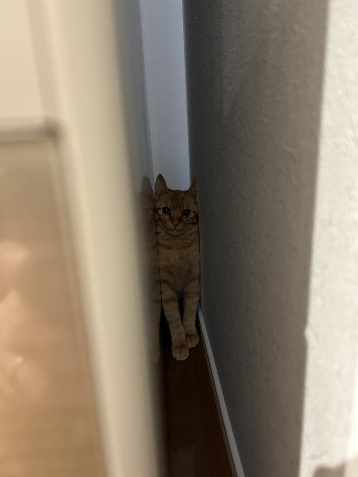 ケージの外では警戒して冷蔵庫と壁の隙間に