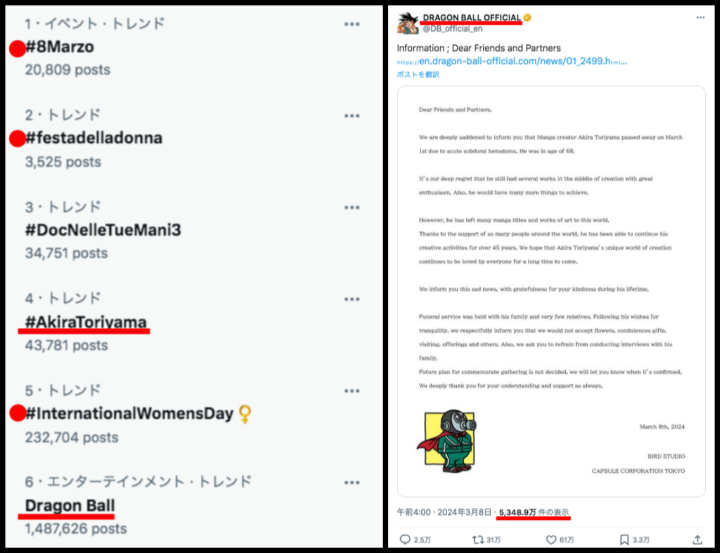 ドラゴンボール公式による英語発表13時間後には、5300万回以上表示、31万回のRT、25000のリプ