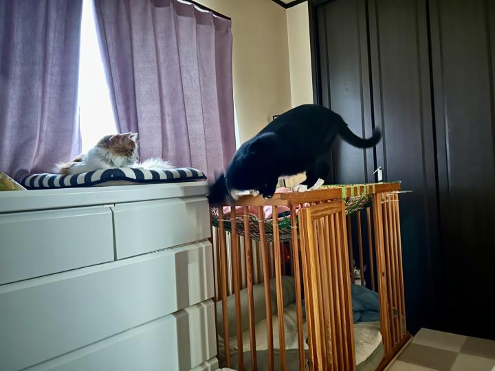 早朝から走り回りたくない福ちゃんはそそくさといつもの避難場所のベッドへ・・・笑