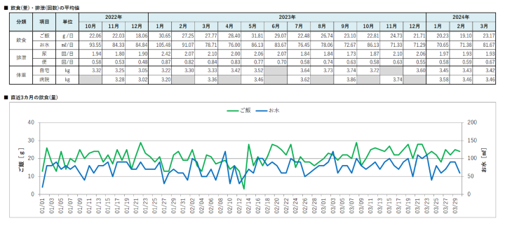 しもちゃんの飲食(量)・排泄(回数)に関する記録です。1~2月は食べる量が減っていたのですけど、3月になって戻ってきました。