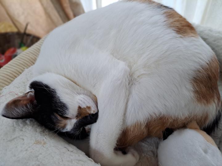 今日は起きてて、外眺めたり保護したネコの母親が相変わらず来るので観察したり、私に遊んで催促してます(笑)