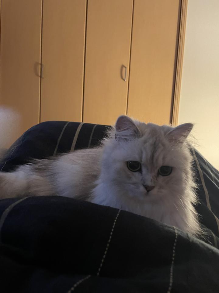 今朝早く目が覚めてしまい、様子を見に行ったらついてきて、お布団の私の上に乗りました。