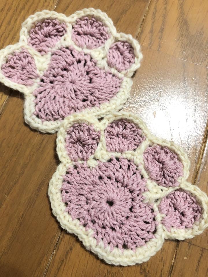 写真は試しに作った肉球コースターとSNSのフォロワーさんから意見があったサマーニット帽。コットン系の糸でゆるっとかぶるタイプ、、、とりあえず作ってみたんですけど、、、