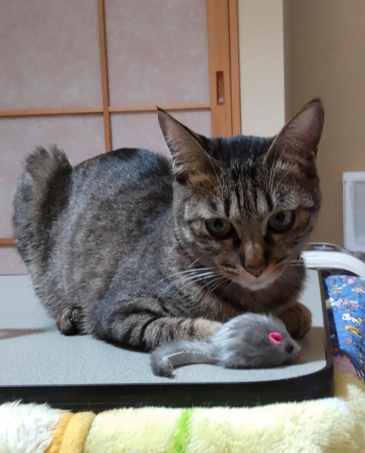 紫音は、10月に足の骨を折って、大学病院で手術までした。退院してからも、段差のあるところは駄目だったから、大きな一段のゲージを作って、私がその中に入って世話をした。😆