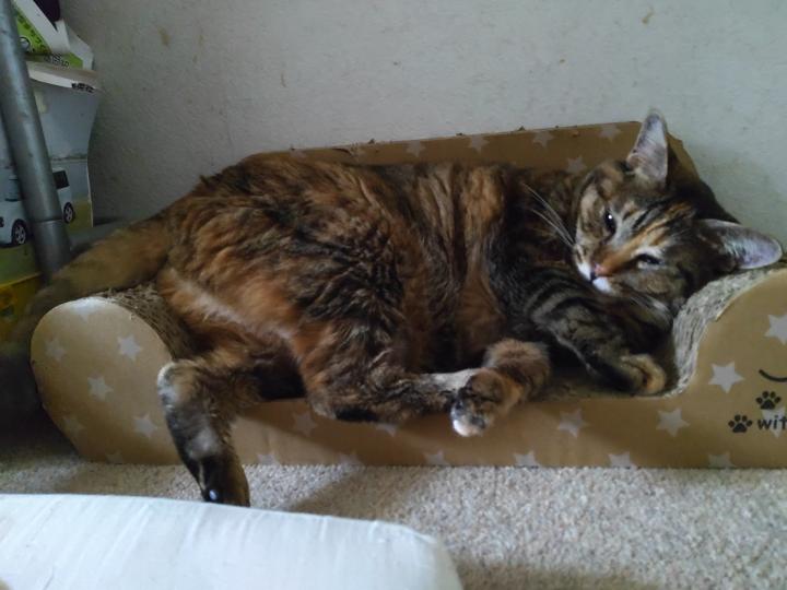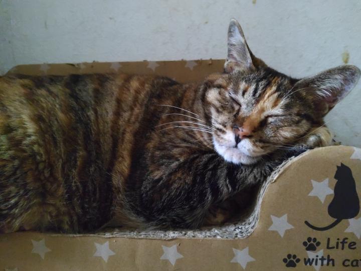 最近、夜はこの爪とぎベッドで寝ているれーゆん。私が寝ている右隣です。