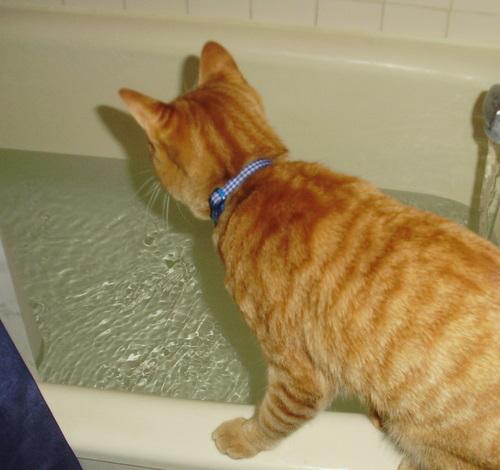お風呂を入れてると、必ずバスタブの淵に座って前足で水で遊ぼうとします。その割に自分のお風呂は嫌がるよね~。何故?