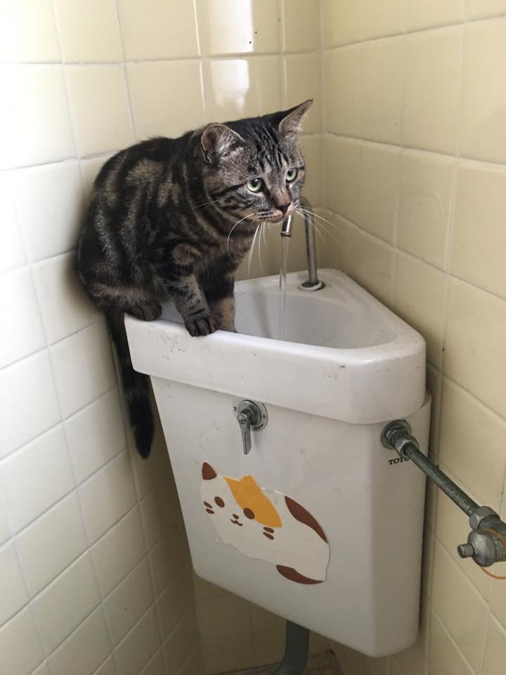 居るトラちゃん、最近のお気に入りの 場所は水洗トイレのタンクです😆