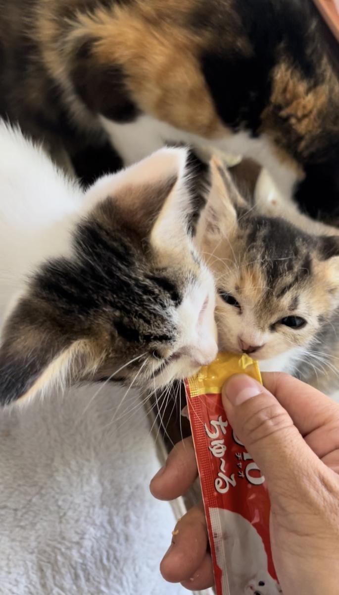 子猫2匹で取り合いです笑 その後、母三毛さんも参加し親子3匹で1本のちゅーるを分け合いました(*´꒳`*)