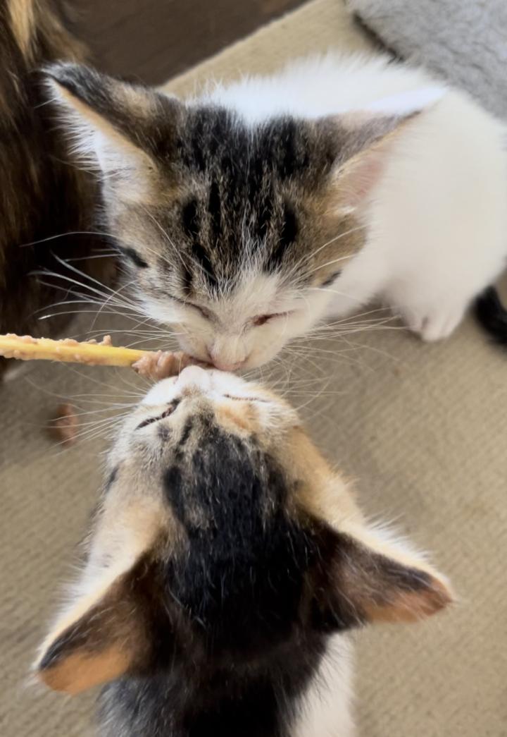 後ろではお皿から母三毛さんも同じウェットフードを食べております(*´꒳`*)