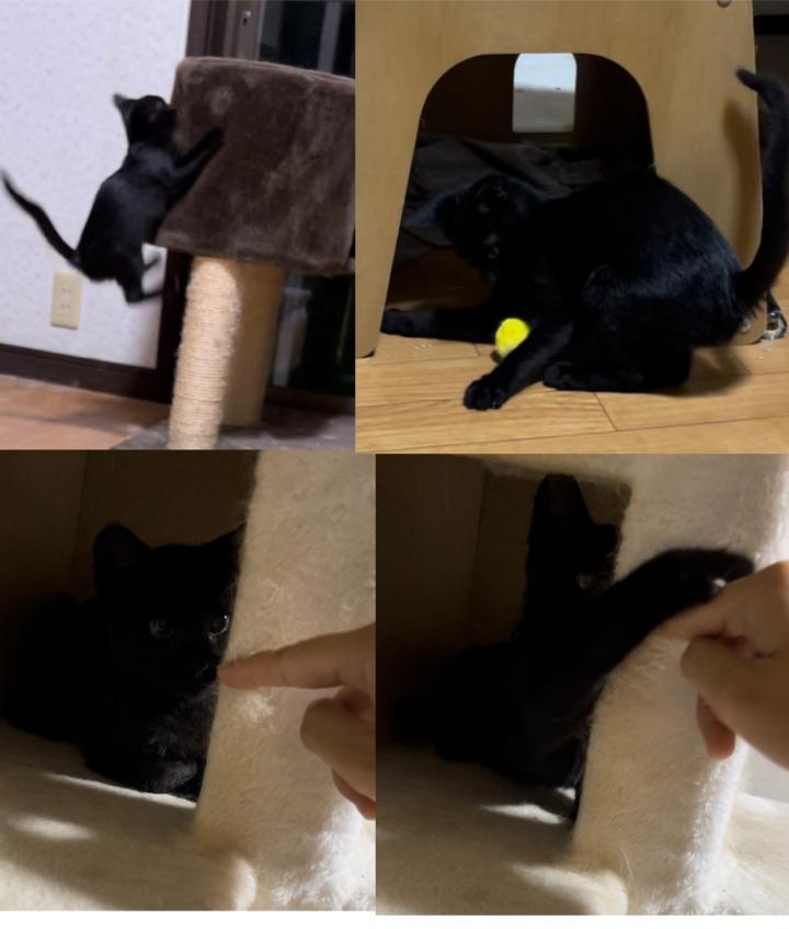キャットタワー(低め)の登頂に見事に失敗してみたり、黄色いボールさんと戯れてみたり、人間と指で遊んでみたり…