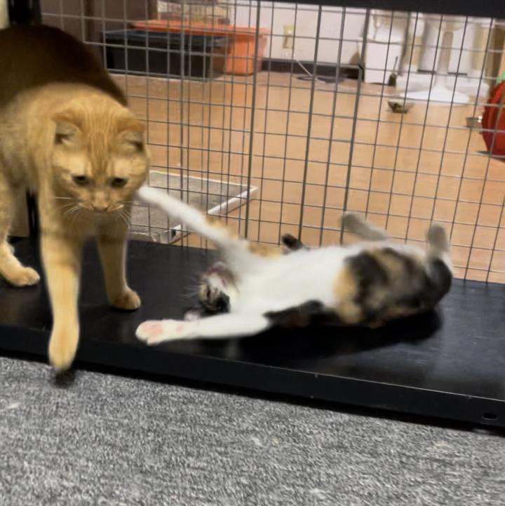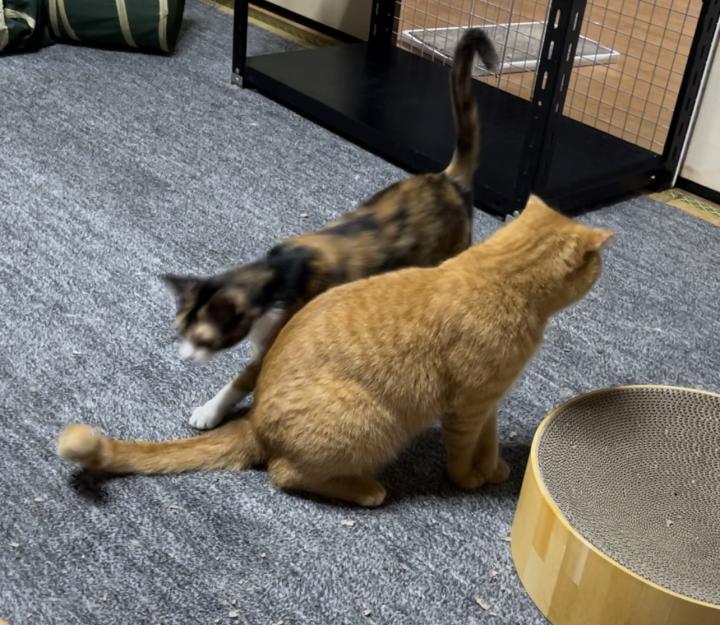 飼い猫の方も、威嚇や嫌悪感も無さそうに尻尾をあげ、数分後には遊び始めておりました(´,,•ω•,,`)