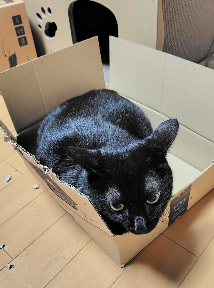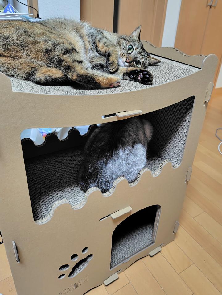 この段ボール猫ハウス、猫たちがとても気に入っていてよく遊ぶのでぶっ壊れが早いんです((+_+))