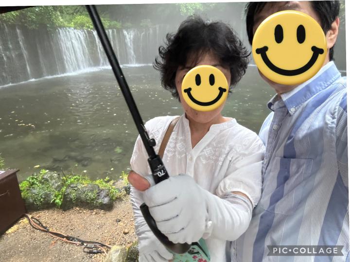 旦那さんは私を滝の前に立たせて写真を撮ってくれたけど、「2人で自撮りしようよ!」と言ってみた。