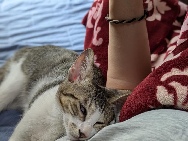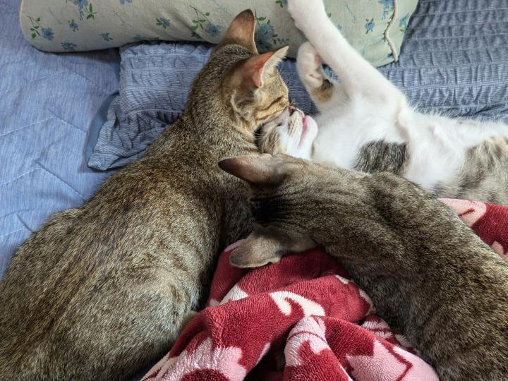 やんちゃで、兄弟ネコにすーぐ噛みつく。
