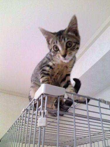 元気娘(猫)は元気いっぱいで朝から三階建てケージの上に(汗)