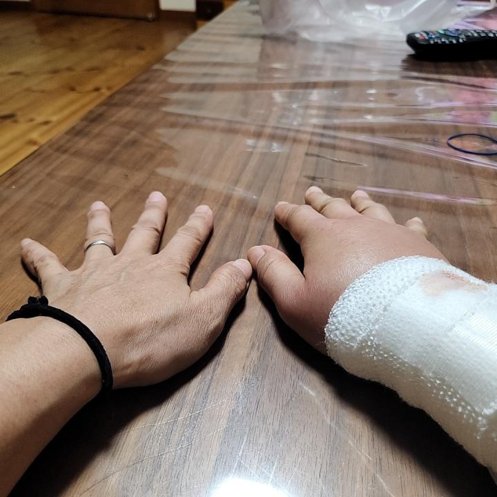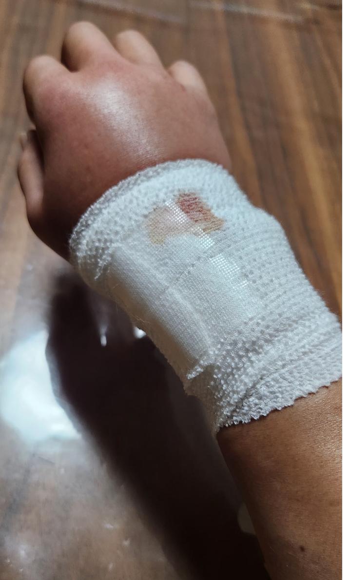 手首を噛まれ、急いで流水で傷口を洗い、結構バッサリいっていたので、血が止まらず。