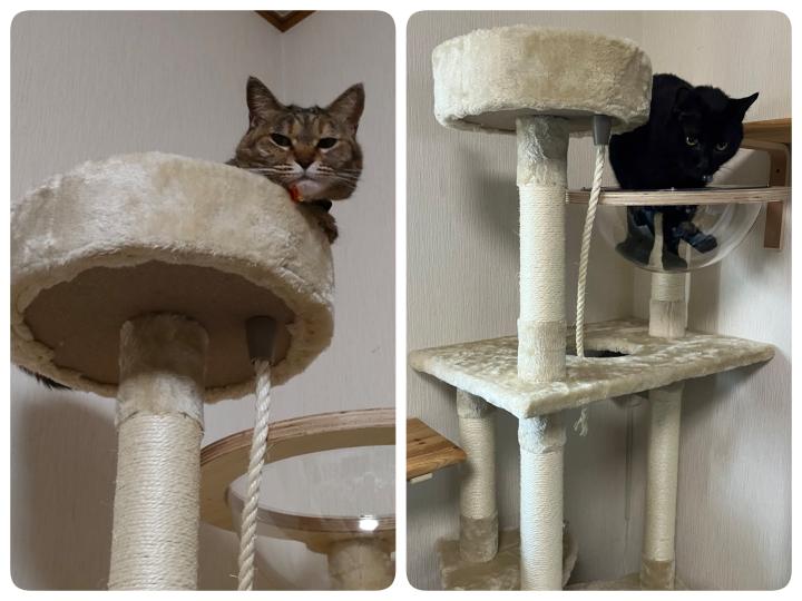 キャットタワー新調柱の縄がズダボロで、中の芯ものんちゃんのガリガリによって穴をあけられて、もう5年ほどは使ったんだしと、同じメーカーのほぼ同じモデルに新調したのだけど、