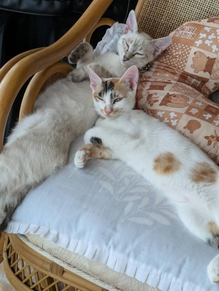 三毛猫はチョー絶美人、白猫は誰もが振り返るイケメン。連日、早朝運動会、夜間運動会して家が賑やかです。